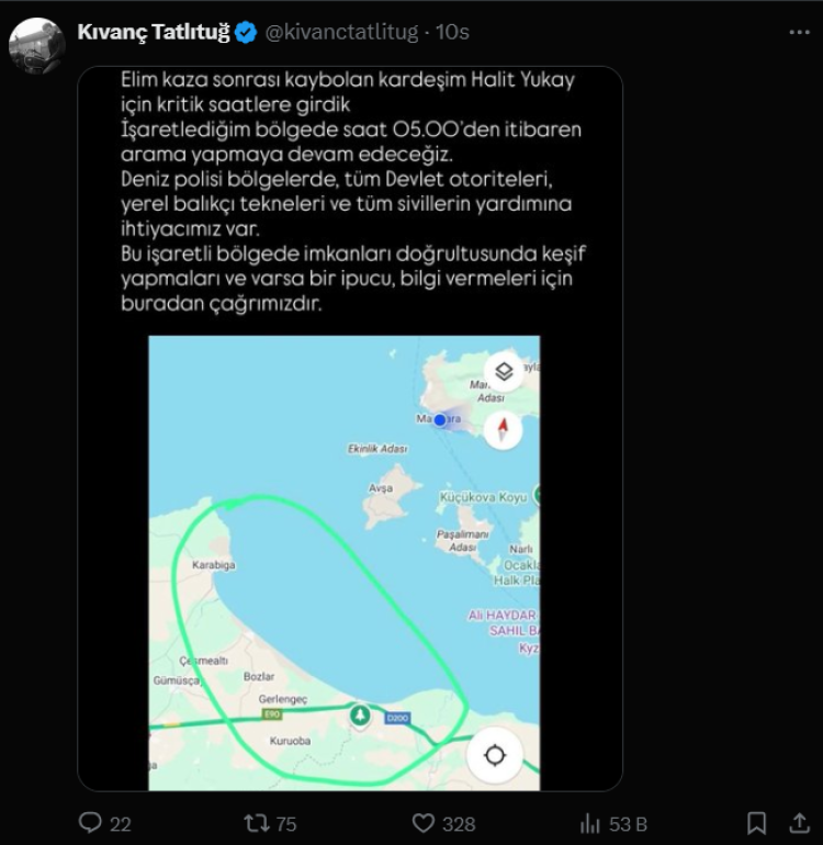 Yalova’dan Bozcaada’ya gitmek için denize açılan iş insanı Halit Yukay’dan beş gündür haber alınamıyor. Teknesi parçalanmış ve yarı batık halde bulunan Yukay’ı arama kurtarma çalışmalarına, yakın dostu oyuncu Kıvanç Tatlıtuğ da katıldı. Tatlıtuğ, sosyal medyadan yardım çağrısı yaptı.