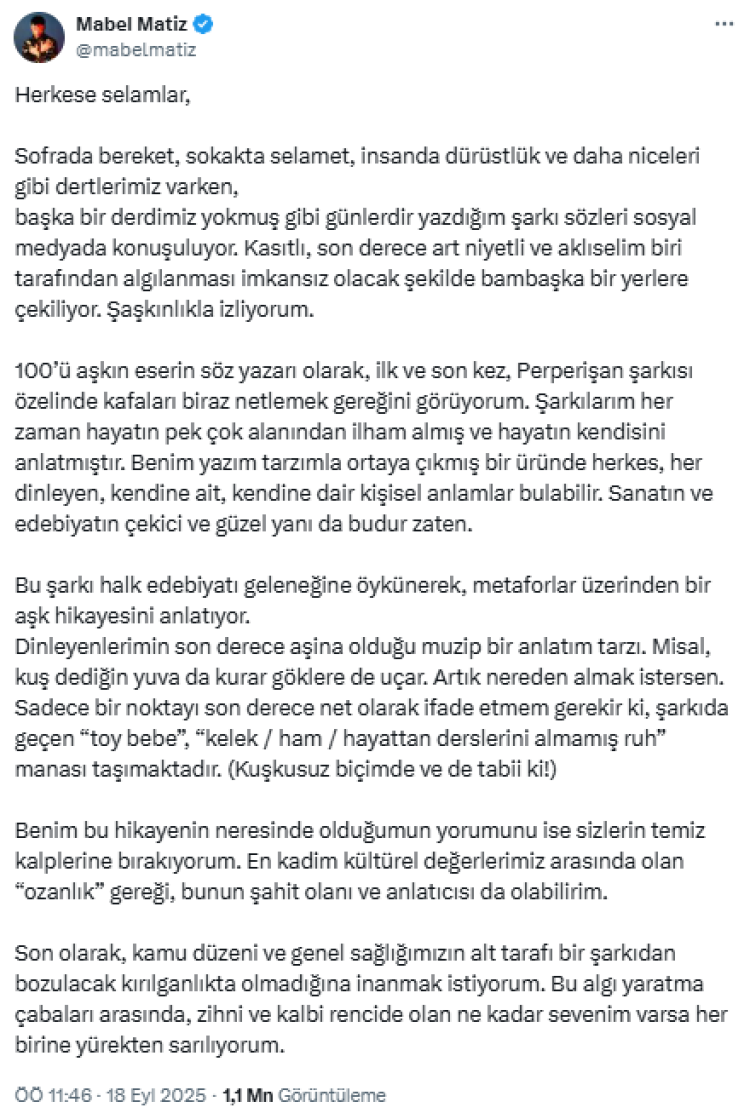 Mabel Matiz, gündem olan Perişan şarkısına yönelik tartışmalara uzun bir açıklamayla yanıt verdi. Sanatçı, sofrada bereketin, sokakta selametin, insanda dürüstlüğün tartışılması gerekirken şarkı sözlerinin kasıtlı olarak yanlış yerlere çekildiğini söyledi. “Kasıtlı, son derece art niyetli ve aklıselim bir tarafından algılanması imkânsız olacak şekilde bambaşka bir yerlere çekiliyor. Şaşkınlıkla izliyorum” ifadelerini kullandı.