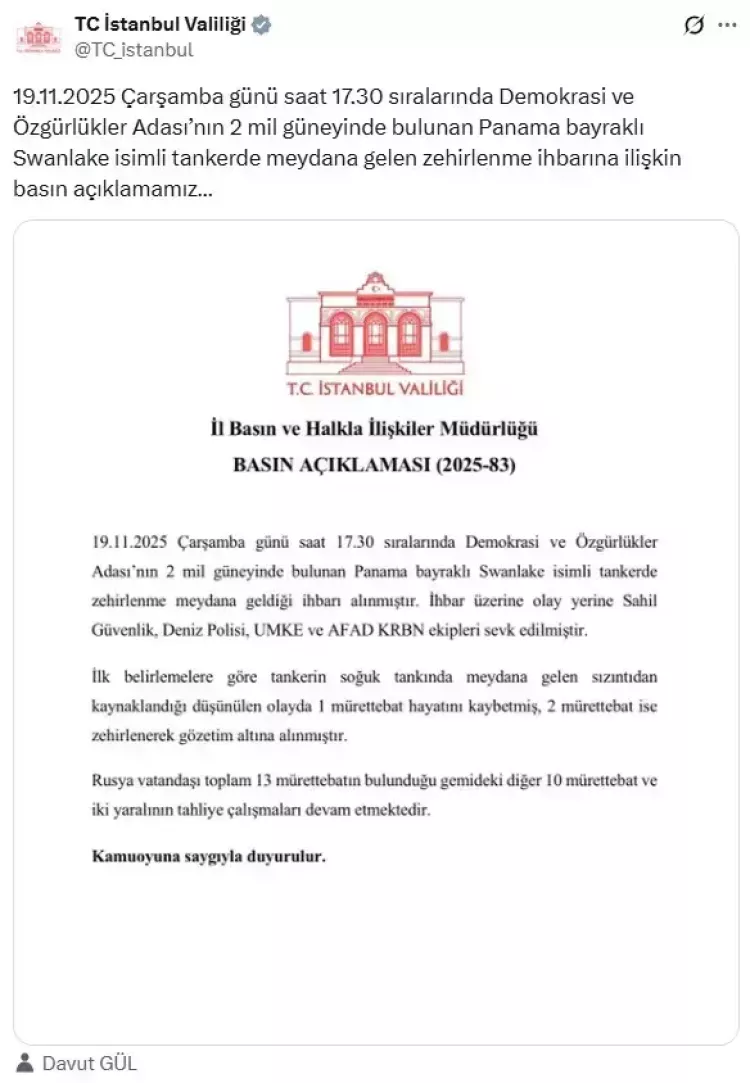 İstanbul Valiliği, saat 17.30 sıralarında gelen ihbar üzerine Sahil Güvenlik, Deniz Polisi, UMKE ve AFAD-KRBN ekiplerinin hızla bölgeye sevk edildiğini açıkladı. Zehirlenen üç kişiden biri olay yerinde hayatını kaybetti; iki kişinin tedbir amaçlı gözetim altında tutulduğu belirtildi.