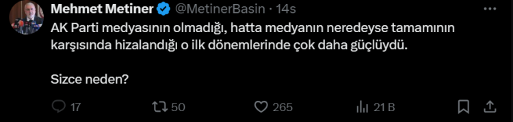 Eski AK Parti milletvekili Mehmet Metiner, sosyal medya hesabından yaptığı paylaşımla iktidara yakın medya kuruluşlarına yönelik dikkat çekici eleştirilerde bulundu. Metiner, AK Parti medyasının olmadığı dönemlerde partinin daha güçlü olduğunu ima etti.
