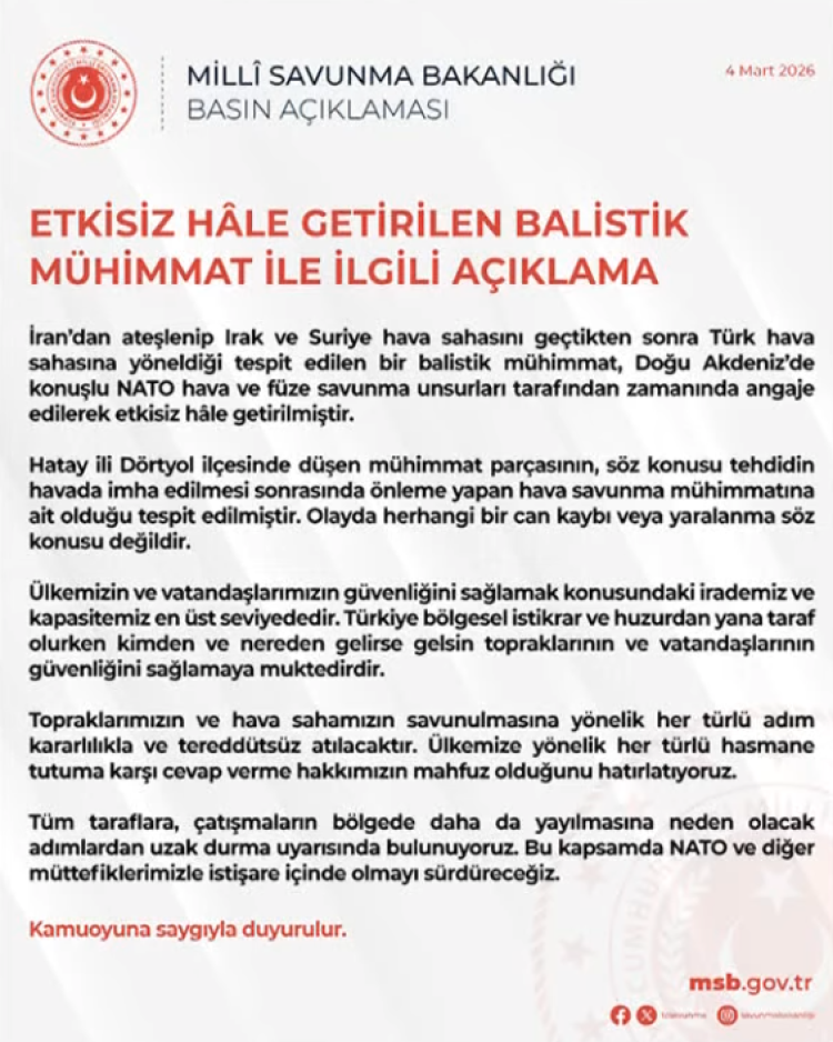 Milli Savunma Bakanlığı (MSB), İran’dan ateşlenen bir balistik mühimmatın Türk hava sahasına yöneldiğinin tespit edildiğini ve söz konusu tehdidin Doğu Akdeniz’de etkisiz hale getirildiğini duyurdu.