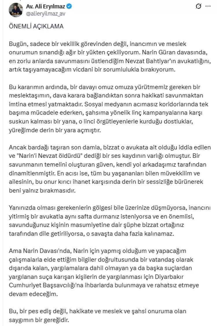 Eryılmaz, açıklamasında müvekkili ve ailesine de sitem ederek, “Bu onur kırıcı ihanet karşısında derin sessizlik beni yalnız bıraktı. Savunduğum kişinin masumiyetine dair şüphe, bizzat ortağım tarafından dile getirildiğinde artık o savaşta kalamazdım” sözleriyle davadan çekilmesinin nedenlerini anlattı.