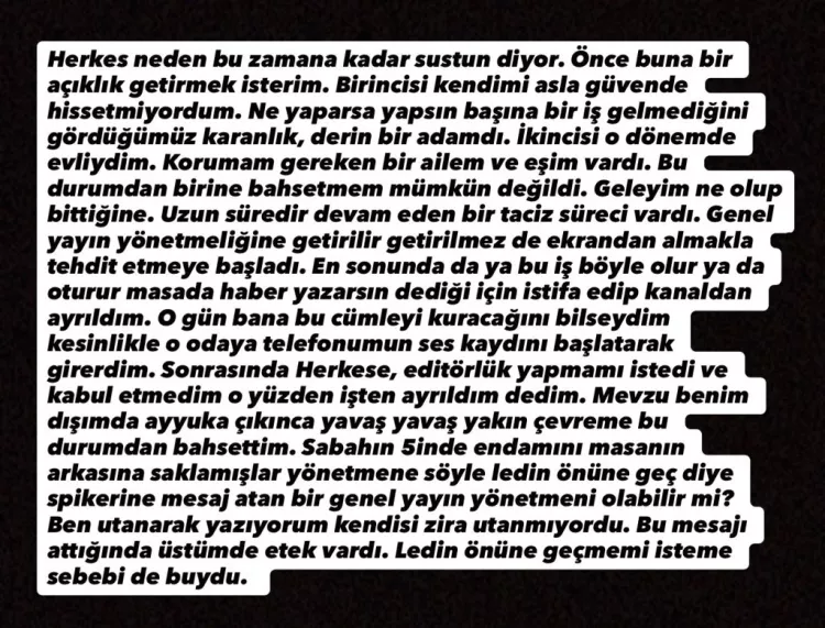 “Uzun süredir devam eden bir taciz süreci vardı. Genel yayın yönetmeni olur olmaz ‘eğer boyun eğmezsen seni ekrandan alırım’ diye tehdit etmeye başladı. ‘Ya bu iş böyle olur ya da masada haber yazarsın’ dedi. O gün o odaya telefonumun ses kaydını açarak girmediğime pişmanım.”