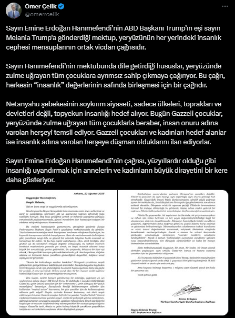 “Sayın Emine Erdoğan Hanımefendi'nin ABD Başkanı Trump'ın eşi Sayın Melania Trump'a gönderdiği mektup, yeryüzünün her yerindeki insanlık cephesi mensuplarının ortak vicdan çağrısıdır. Mektupta dile getirilen hususlar, zulme uğrayan tüm çocuklara ayrımsız sahip çıkmaya çağırıyor. Bu çağrı, herkesin insanlık değerlerinin safında birleşmesi için güçlü bir davettir.”
