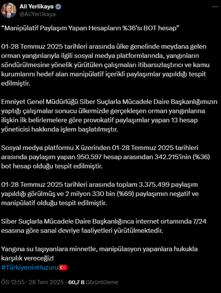 Bakan Yerlikaya, orman yangınlarıyla ilgili provokatif sosyal medya içerikleri nedeniyle 13 kişi hakkında işlem başlatıldığını açıkladı. EGM'nin tespitlerine göre, Temmuz'da 950 bin hesap arasında 342 bini bot hesap çıkarken; içeriklerin çoğu manipülatifti.
