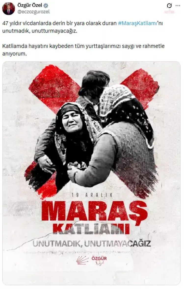 Özel, katliamda hayatını kaybeden tüm yurttaşları saygı ve rahmetle andığını belirterek, acının yalnızca belirli bir kesimin değil, tüm Türkiye toplumunun ortak yarası olduğunu dile getirdi.