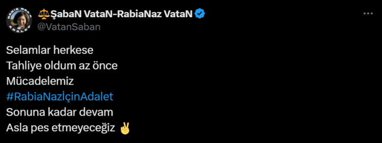 “Selamlar herkese. Tahliye oldum az önce. Mücadelemiz #RabiaNazİçinAdalet. Sonuna kadar devam… Asla pes etmeyeceğiz.”