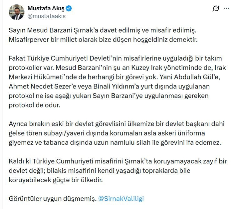 Mustafa Akış, Barzani’nin Irak’ta veya Irak merkezi yönetiminde resmî bir görevinin bulunmadığını hatırlatarak, Türkiye’ye yapılan bu nitelikteki ziyaretlerde uygulanacak protokolün açık olduğunu belirtti. Akış’a göre, resmî görevi olmayan bir isim için askeri üniforma ve uzun namlulu silah eşliğinin kabul edilebilir olmadığı; devlet başkanı dahi gelse tören subayı/yaveri dışında korumaların bu şekilde bulunamayacağı ifade edildi.