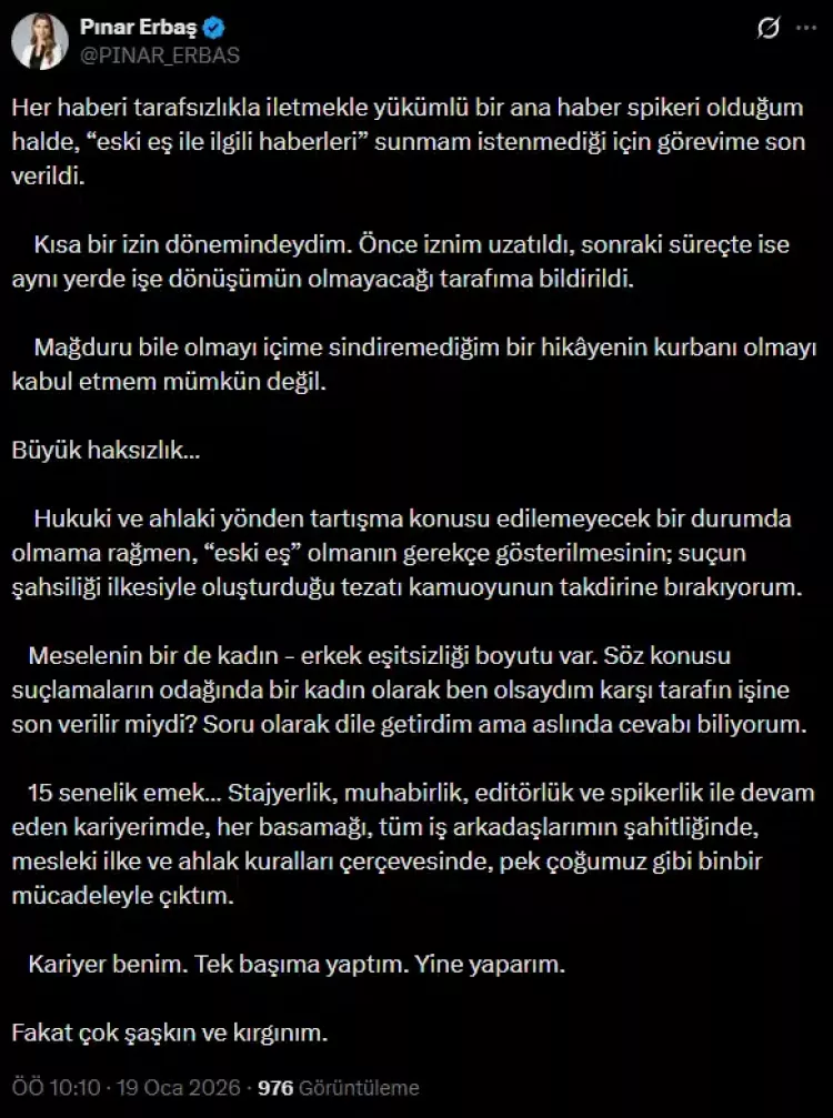 15 yıllık meslek hayatını hatırlatan Erbaş, stajyerlikten spikerliğe uzanan kariyerini kendi emeğiyle inşa ettiğini belirtti. Açıklamasını, “Kariyer benim. Tek başıma yaptım. Yine yaparım. Ama çok şaşkın ve kırgınım” sözleriyle tamamladı.