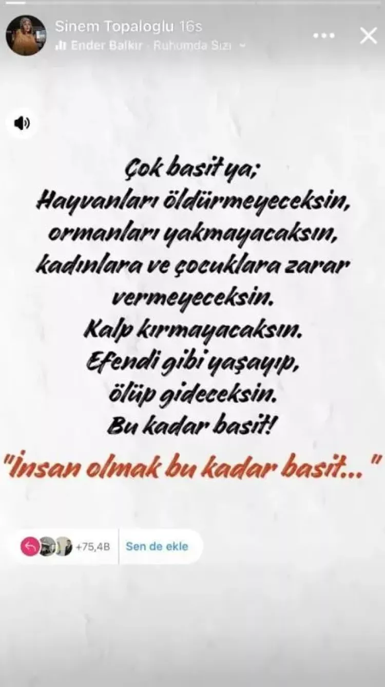 Hayatını kaybeden Sinem Somun’un ise ölümünden kısa süre önce sosyal medyada insanlık dersi niteliğinde bir mesaj paylaştığı görüldü. Mesajında, “Hayvanları öldürmeyeceksin, ormanları yakmayacaksın, kadınlara ve çocuklara zarar vermeyeceksin. Kalp kırmayacaksın... İnsan olmak bu kadar basit” sözleri yer aldı.