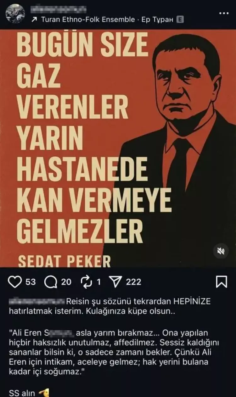 Cinayetten birkaç gün önce Ali Eren S.’nin sosyal medya hesabından tehdit ve intikam içerikli bir paylaşım yaptığı belirlendi. Paylaşımda, “Ali Eren için intikam aceleye gelmez. Hak yerini bulana kadar içi soğumaz.” ifadeleri yer aldı.