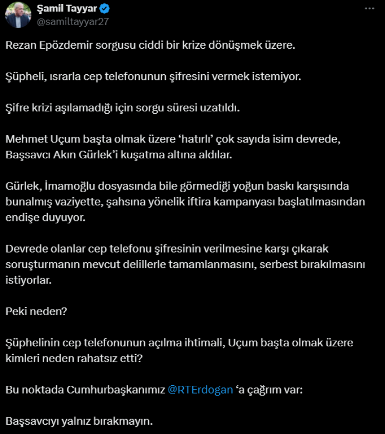 Şamil Tayyar, X hesabından yaptığı paylaşımda, Rezan Epözdemir’in cep telefonu şifresini vermemesi nedeniyle sorgunun uzadığını ve bu süreçte Mehmet Uçum başta olmak üzere “etkili isimlerin” devreye girerek İstanbul Cumhuriyet Başsavcısı Akın Gürlek üzerinde baskı kurduğunu iddia etti.