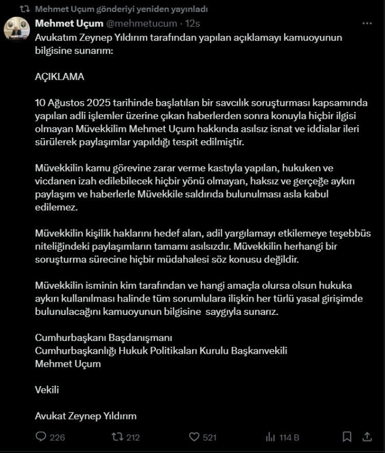 Mehmet Uçum’un avukatı Zeynep Yıldırım, Tayyar’ın iddialarına sert tepki gösterdi. Yıldırım, yaptığı açıklamada “Müvekkilimin herhangi bir soruşturma sürecine müdahalesi söz konusu değildir” diyerek tüm suçlamaların asılsız olduğunu savundu.