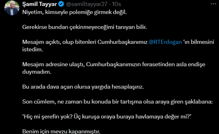 Avukatın açıklamasına yanıt gecikmedi. Şamil Tayyar, “Niyetim polemik değil, mesajım Cumhurbaşkanımıza ulaştı” dedikten sonra, sert bir çıkış yaparak şunları söyledi: