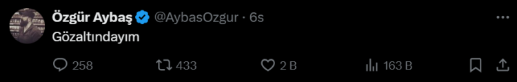 Aybaş, gelişmeyi kişisel sosyal medya hesabı üzerinden paylaştığı kısa bir mesajla duyurdu. X platformunda yaptığı açıklamada yalnızca “Gözaltındayım” ifadesine yer verdi.