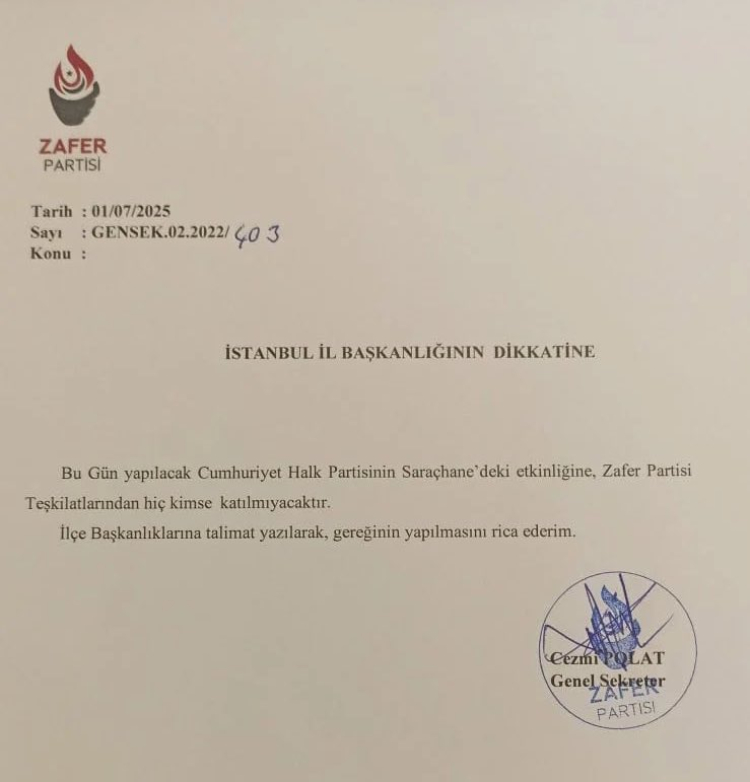Zafer Partisi, teşkilatlarına Saraçhane’de bugün gerçekleştirilecek İmamoğlu mitingine hiçbir üyenin katılmaması talimatını iletti.