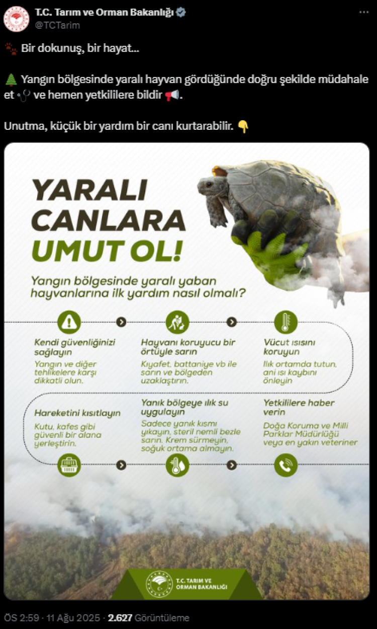 Tarım ve Orman Bakanlığı, orman yangınlarında yaralanan yaban hayvanlarına ilk müdahale için tavsiyeler verdi. Hayvanları koruyucu örtüyle sarın, ılık tutulmasını ve güvenli alana alınmasını sağlayın. Doğru müdahale hayat kurtarır vurgusu yapıldı.