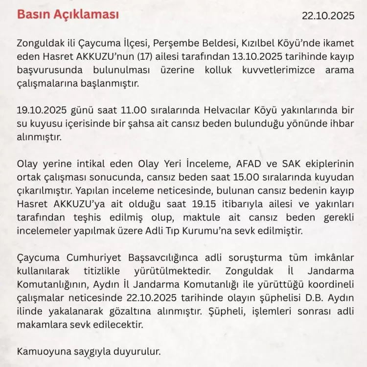 Çaycuma’ya bağlı Perşembe beldesi Koramanlar köyü kırsalında hayvanlarını otlatan köylüler, 19 Ekim sabahı bir su kuyusunda ceset fark etti. İhbar üzerine bölgeye gelen jandarma ve sağlık ekipleri, kuyudan çıkarılan cesedin 12 Ekim’den beri kayıp olan Hasret Akkuzu’ya ait olduğunu belirledi.