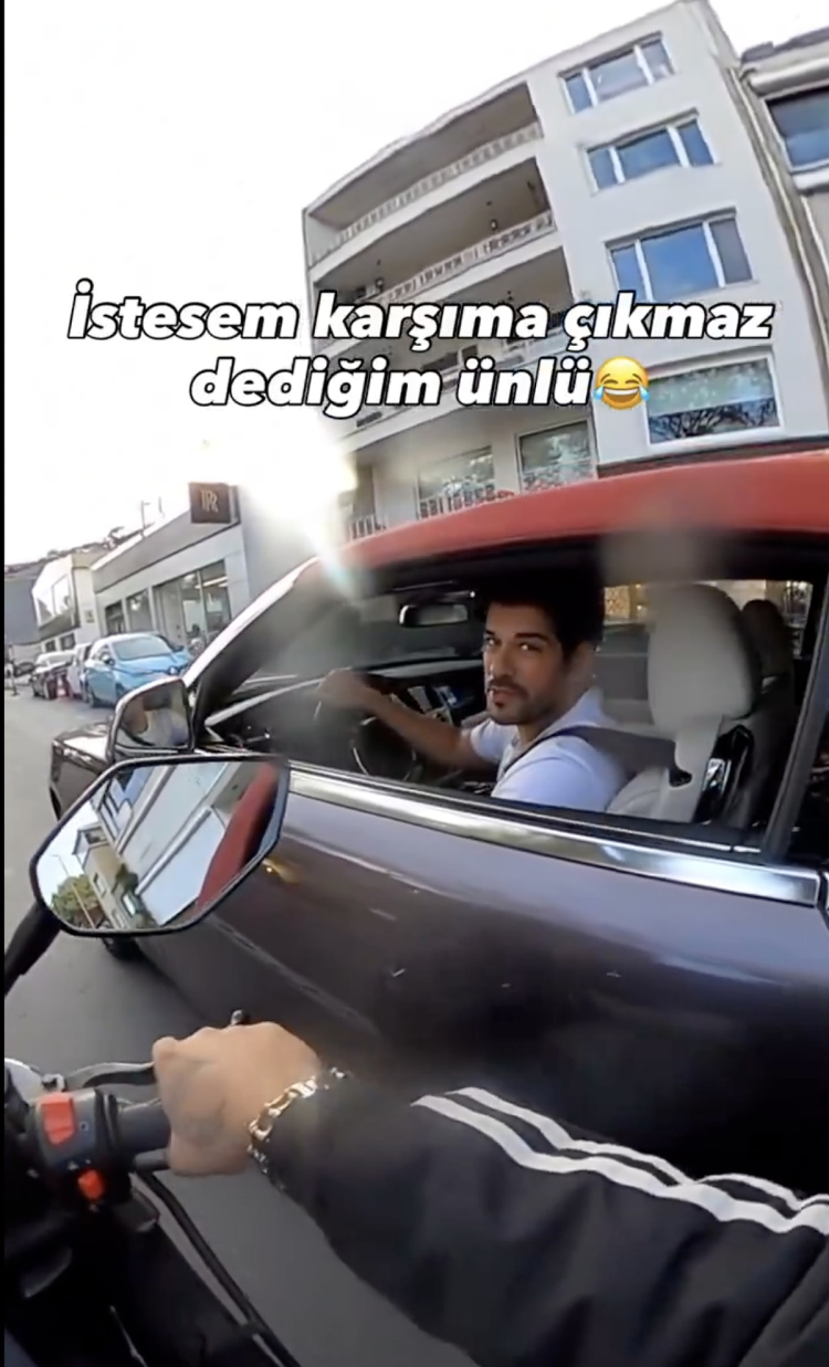 Lüks aracıyla ilerleyen Burak Özçivit’in yanına yaklaşan motorcu, heyecanla “Abi ben de oyuncu olmak istiyorum, nasıl olacağım?” diye seslendi. Kısa süreli şaşkınlık yaşayan Özçivit, gülümseyerek “Keşke bir yöntemi olsa da söylesem sana” cevabını verdi.