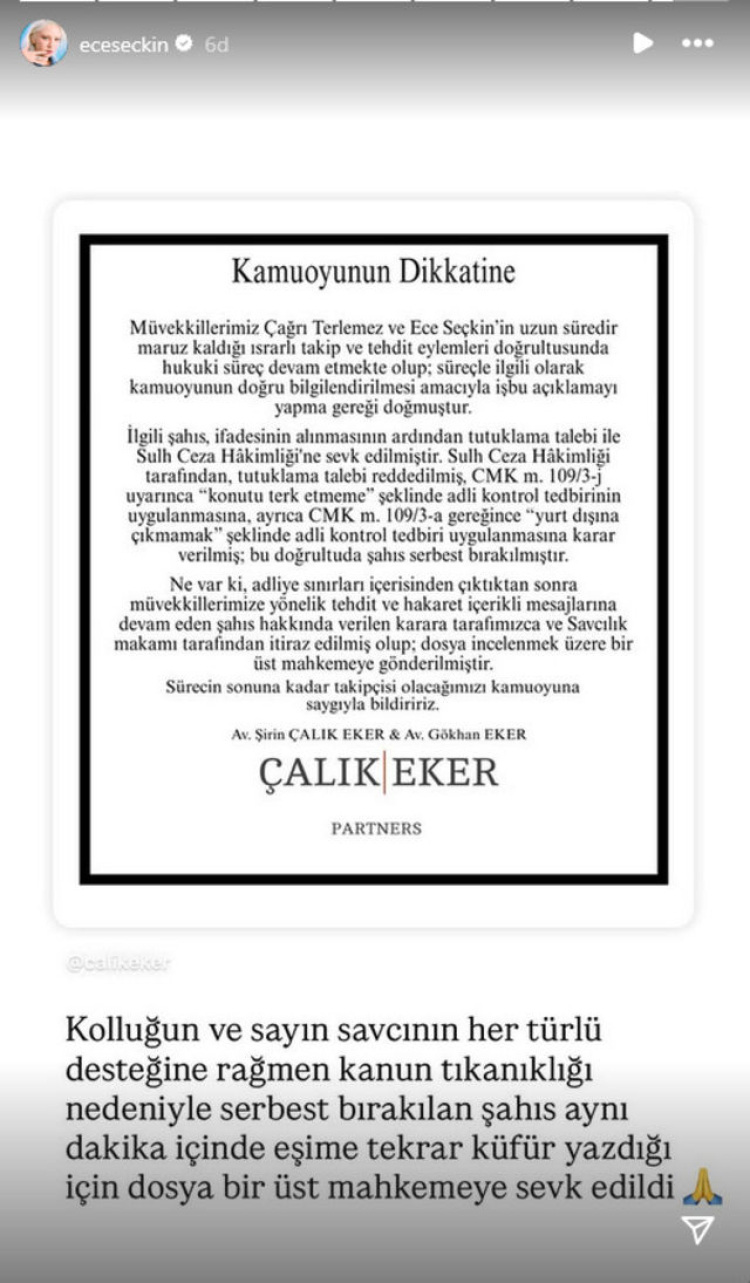 Ünlü şarkıcı Ece Seçkin, kendisini ve pilot eşi Çağrı Terlemez’i yaklaşık 4 yıldır ölümle tehdit eden bir şahıs hakkında sosyal medyada yardım çağrısı yapmıştı. Tehdit ve tacizlere maruz kalan Seçkin, yetkililerden "Bu şahıs serbest bırakılmasın" diyerek sesini duyurmaya çalıştı.