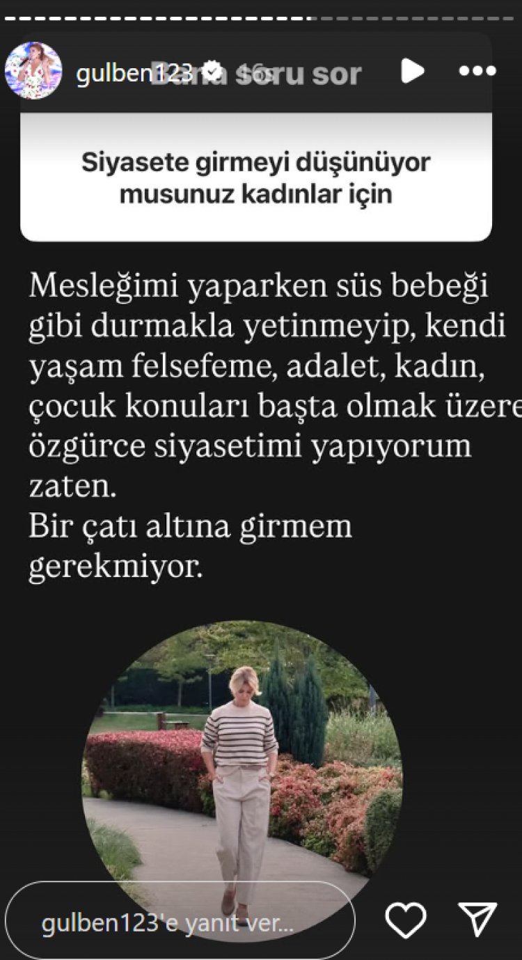 Ünlü sanatçı Gülben Ergen, sosyal medya hesabında gerçekleştirdiği soru-cevap etkinliği sırasında gelen “Kadınlar için siyasete girmeyi düşünüyor musunuz?” sorusuna dikkat çeken bir yanıt verdi.