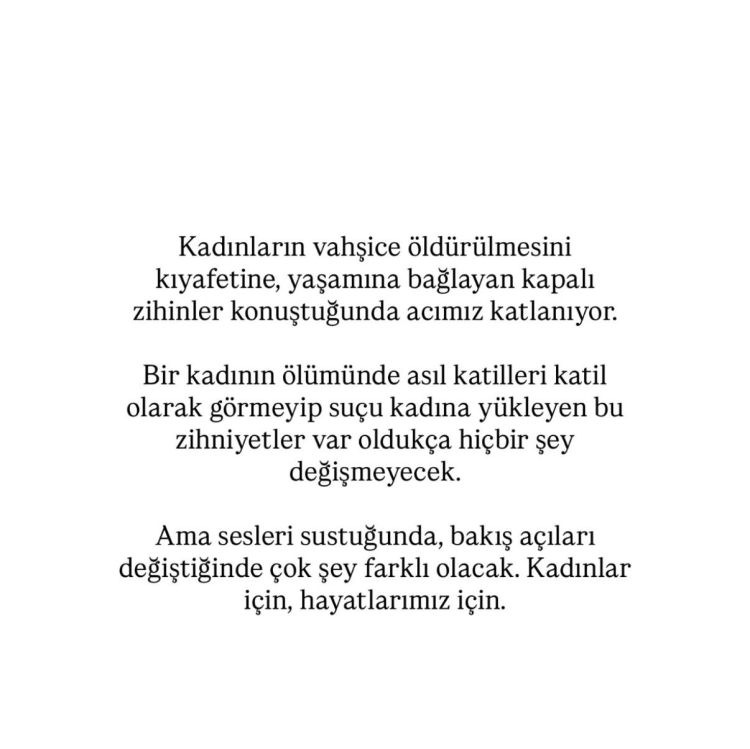 Bir kadının ölümünde asıl katilleri katil olarak görmeyip, suçu kadına yükleyen bu zihniyetler var oldukça hiçbir şey değişmeyecek.
