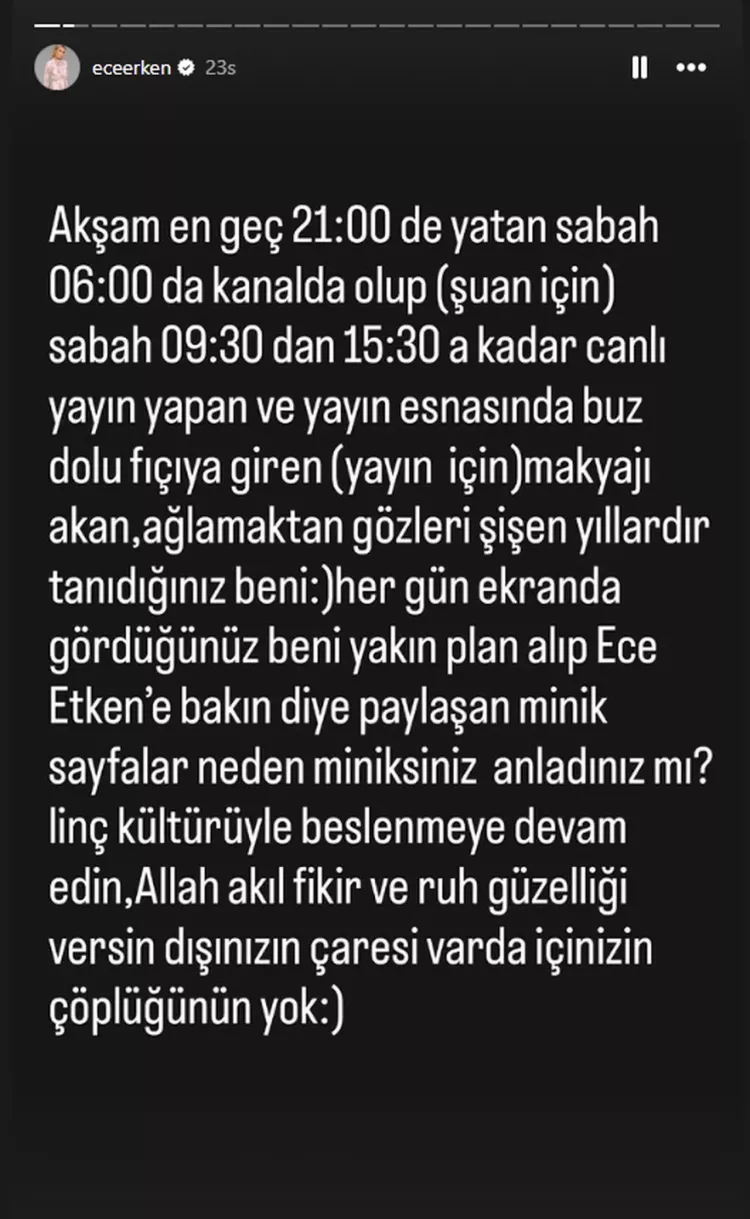 Sunucu, kendisi hakkında yapılan paylaşımlara kişisel hesabından açıklama yaparak tepki gösterdi. Uzun yayın saatleri boyunca ekranda olduklarını vurgulayan ünlü isim, linç kültürünü eleştirerek, dış görünüş üzerinden yapılan yorumlara sert ifadelerle yanıt verdi.