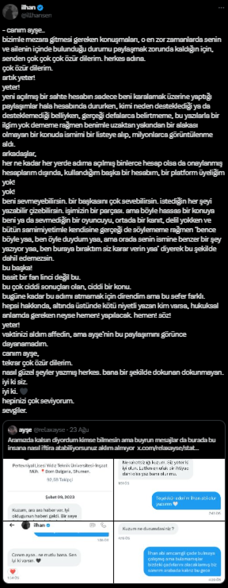 X platformunda bazı mesajların kendisine ait olduğu iddia edilen oyuncu İlhan Şen, iddiaları sert dille yalanladı. Depremzede bir gençle yaptığı yazışmaları da paylaşarak, “Artık yeter! Ortada hiçbir kanıt yokken ismimi karalama listelerine ekleyemezsiniz” ifadelerini kullandı.