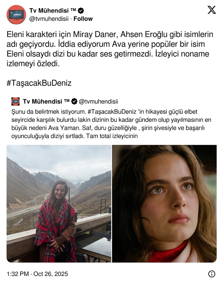 Cuma akşamlarının reyting rekortmeni Taşacak Bu Deniz dizisinde Ava Yaman’ın hayat verdiği “Eleni” karakteriyle ilgili kulis bilgisi ortaya çıktı. Sosyal medyada paylaşılan iddiaya göre yapımcılar, rol için ilk etapta Ahsen Eroğlu ve Miray Daner’i düşünmüş.