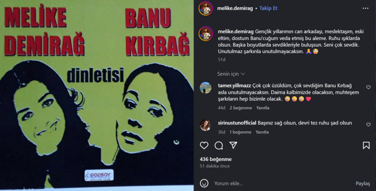"Gençlik yıllarımın can arkadaşı, meslektaşım, eski eltim, dostum Banu’cuğum veda etmiş bu aleme. Ruhu ışıklarda olsun. Başka boyutlarda sevdikleriyle buluşsun. Seni çok sevdik. Unutulmaz şarkınla unutulmayacaksın" ifadelerine yer verdi.