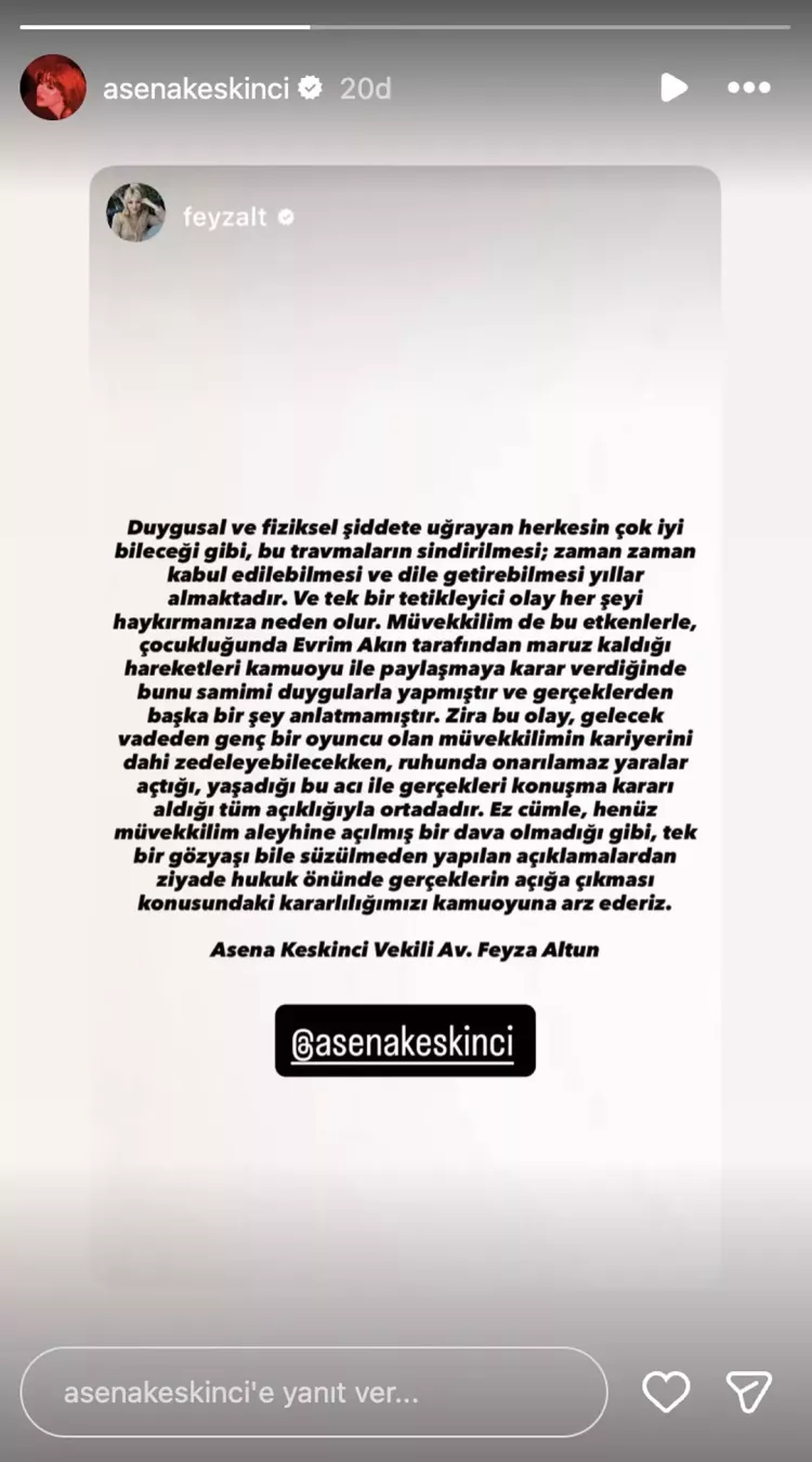 Akın, savunmasını yalnızca sözle sınırlı bırakmadı; Asena Keskinci ile “7 yıl önce”ye tarihlenen mesajlaşmaları sosyal medya hesabında paylaştı. Bununla da yetinmeyen oyuncu, Keskinci’nin annesiyle yaptığı yazışmaları da yayımlayarak, iddialara “belgeyle” karşılık vermeyi tercih etti.