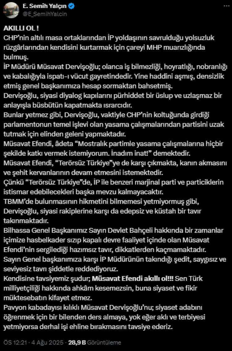 MHP Genel Başkan Yardımcısı Semih Yalçın, İYİ Parti lideri Dervişoğlu'nun sözlerine X hesabından yaptığı açıklama ile cevap verdi. Yalçın, Dervişoğlu'nun siyasi diyalog kapılarını kapattığını ve "Terörsüz Türkiye" çalışmalarına da karşı çıktığını iddia etti. Yalçın, Dervişoğlu için "Müsavat Efendi akıllı ol!" diyerek, "pavyon kabadayısı kılıklı" ifadesini kullandı ve siyaset adabını öğrenmesi gerektiğini söyledi.