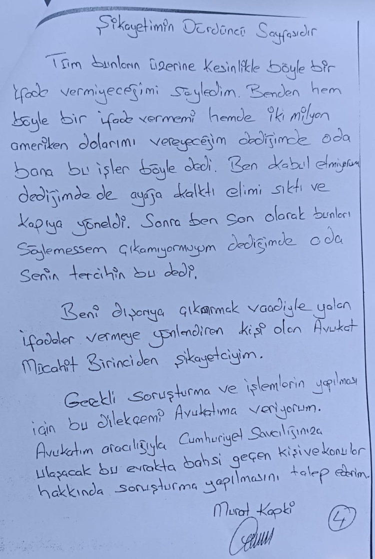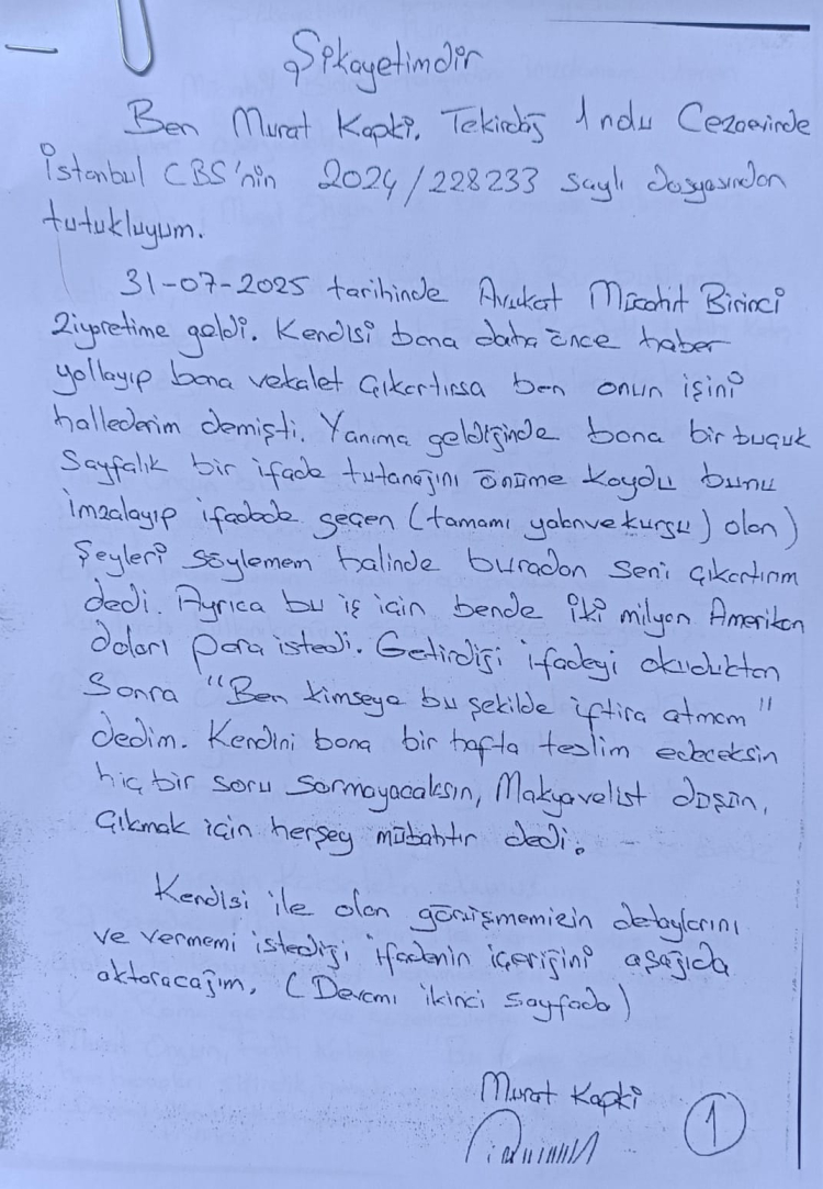 “Mücahit Birinci, İBB soruşturmasında tutuklu iş insanı Murat Kapki’ye giderek 1,5 sayfalık bir ifade uzattı. Bu ifadeyi imzalaması, çeşitli isimler hakkında iftirada bulunması ve 2 milyon dolar vermesi karşılığında tahliye olacağını söyledi. Kapki bunu reddetti ve suç duyurusunda bulundu.”