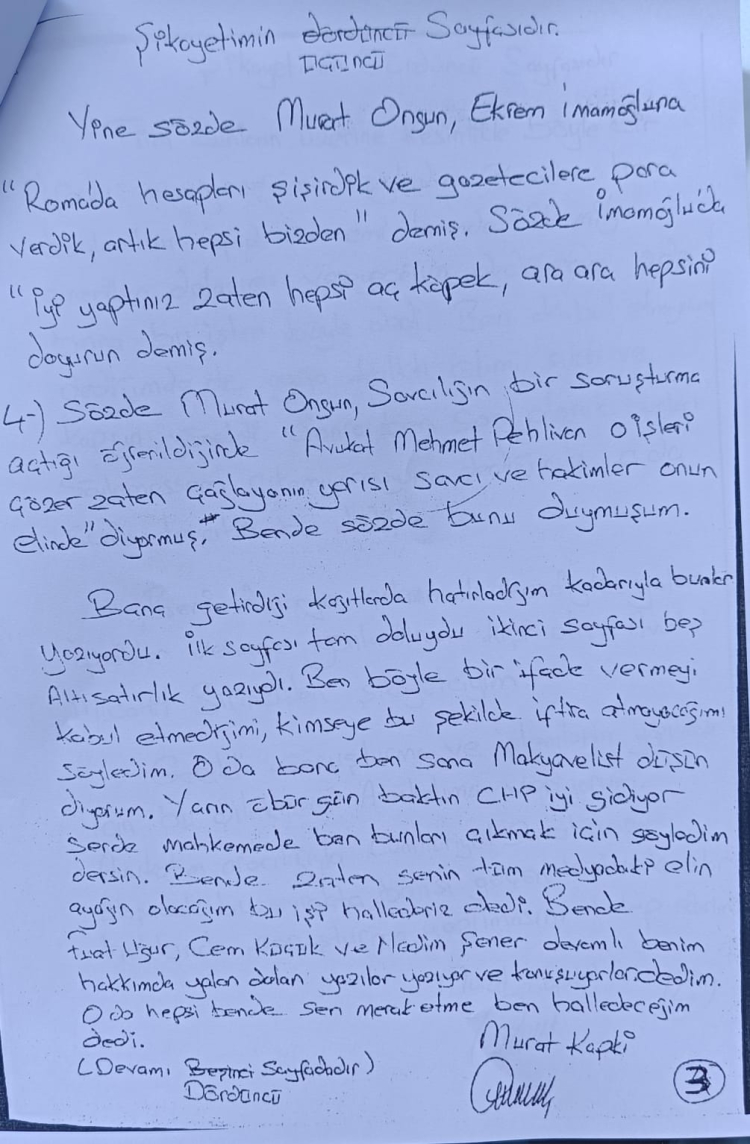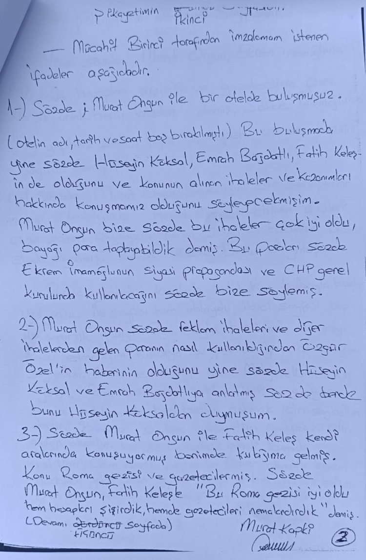 Özel’in paylaştığı dilekçeye göre, ifadede Ekrem İmamoğlu, Murat Ongun, Fatih Keleş ve bazı gazeteciler hakkında “Roma gezisinde hesap şişirme, gazetecilere para verme” gibi iddialar yer alıyordu.