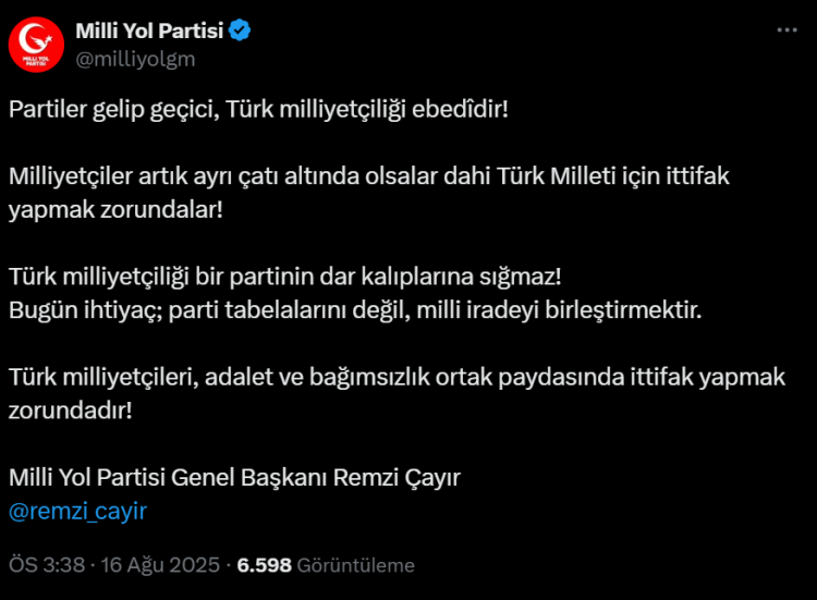Milli Yol Partisi’nin resmi X hesabından yapılan açıklamada, Genel Başkan Remzi Çayır’ın mesajına yer verildi. Çayır, “Partiler gelip geçici, Türk milliyetçiliği ebedîdir. Milliyetçiler artık ayrı çatı altında olsalar dahi Türk Milleti için ittifak yapmak zorundalar” ifadelerini kullandı.