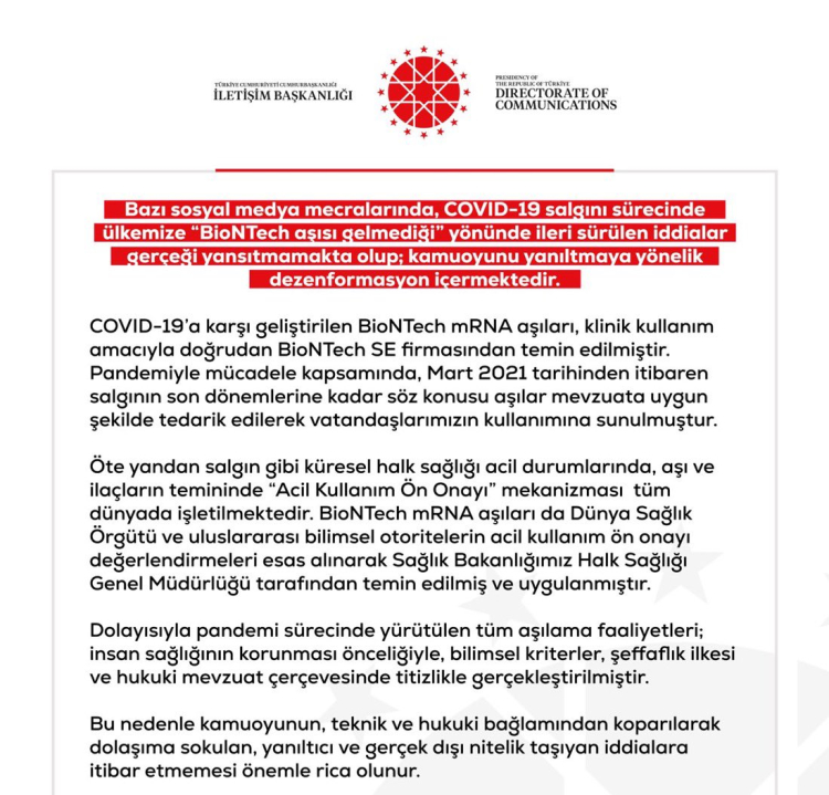 Cumhurbaşkanlığı İletişim Başkanlığı, COVID-19 sürecinde Türkiye’ye BioNTech aşısının gelmediği yönündeki iddiaların gerçeği yansıtmadığını belirterek kamuoyunu yanıltmaya yönelik dezenformasyon uyarısında bulundu.