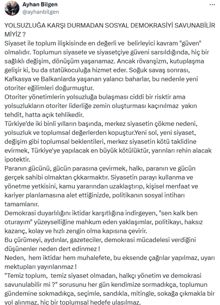 Ayhan Bilgen’den dikkat çeken çıkış: Yolsuzluğa karşı durmadan sosyal demokrasiyi savunabilir miyiz?