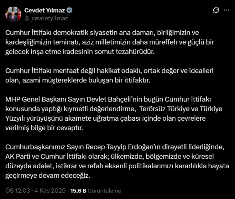 Cevdet Yılmaz, paylaşımında Cumhurbaşkanı Recep Tayyip Erdoğan’ın “dirayetli liderliğine” vurgu yaparak, AK Parti ve MHP ortaklığının adalet, istikrar ve refah eksenli politikaları sürdüreceğini belirtti. Açıklama, Cumhur İttifakı’nda olası bir ayrışma tartışmasını kapatma hamlesi olarak yorumlandı.