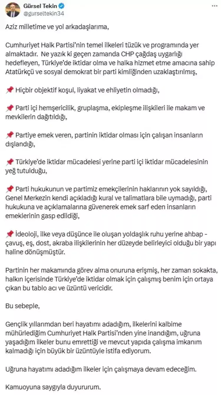Gürsel Tekin, Şubat 2024’te CHP’den istifa etmiş ve partiyi ağır ifadelerle eleştirmişti. Sosyal medya hesabından yaptığı açıklamada, CHP’nin Atatürkçü ve sosyal demokrat kimliğinden uzaklaştığını, liyakat ve ehliyetin yok sayıldığını, parti içi gruplaşma ve hemşericilik ilişkilerinin hakim olduğunu söylemişti.