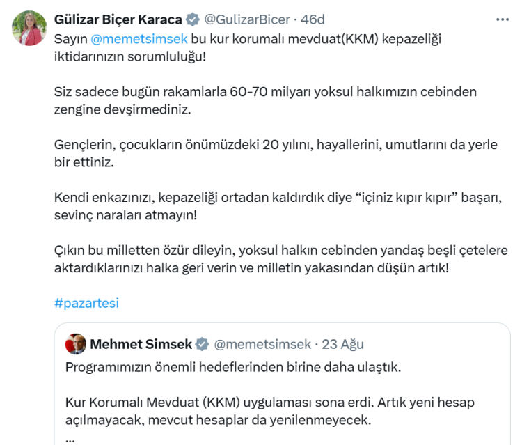 CHP Denizli Milletvekili Gülizar Biçer Karaca, Hazine ve Maliye Bakanı Mehmet Şimşek’in Kur Korumalı Mevduat (KKM) uygulamasının sona ermesiyle ilgili paylaşımına sert tepki gösterdi. Karaca, “Yoksul halkın cebinden yandaşlara aktardıklarınızı halka geri verin, milletten özür dileyin” dedi.