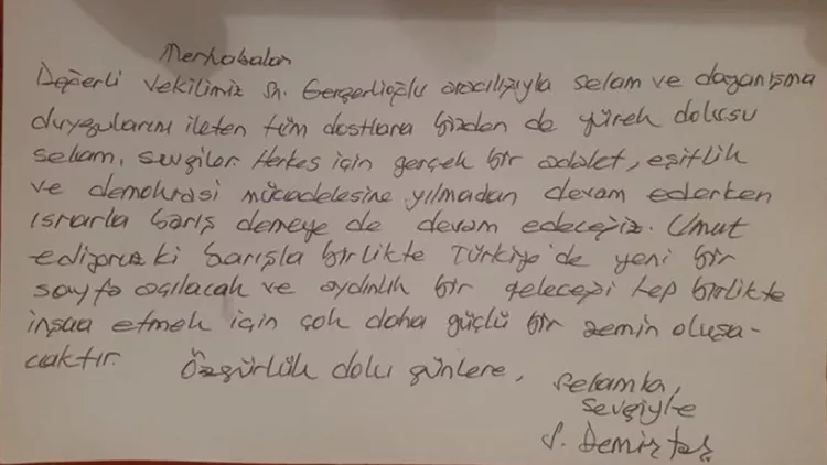 Demirtaş, mesajında herkese hitap ettiğini vurgulayarak şu ifadeleri kullandı: “Herkes için gerçek bir adalet, eşitlik ve demokrasi mücadelesine yılmadan devam ederken, ısrarla barış demeye de devam edeceğiz.”