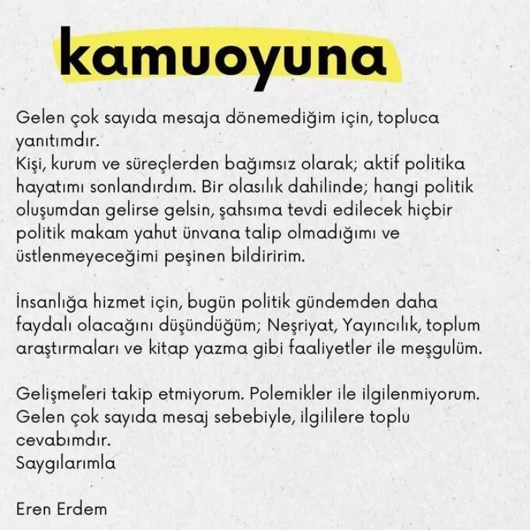 Eski CHP Genel Başkan Yardımcısı Eren Erdem, siyasi hayatını noktaladığını ve herhangi bir siyasi görev veya unvan talep etmeyeceğini açıkladı.