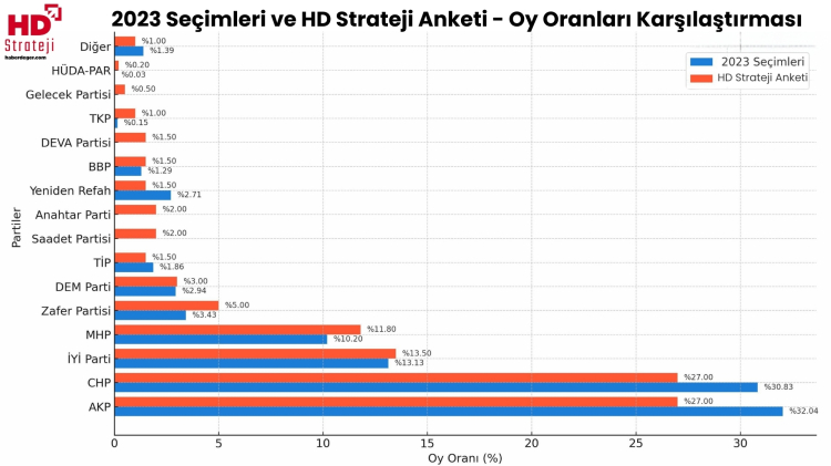 HD Strateji’nin anketi, Ankara’daki siyasi dengelerin köklü bir değişime evrilebileceğini gösteriyor. AKP ve CHP’nin oy kaybı, seçmenin ana akım partilere duyduğu güvenin zayıfladığını işaret ederken; milliyetçi ve küçük partilerin yükselişi yeni ittifak senaryolarını gündeme taşıyor.