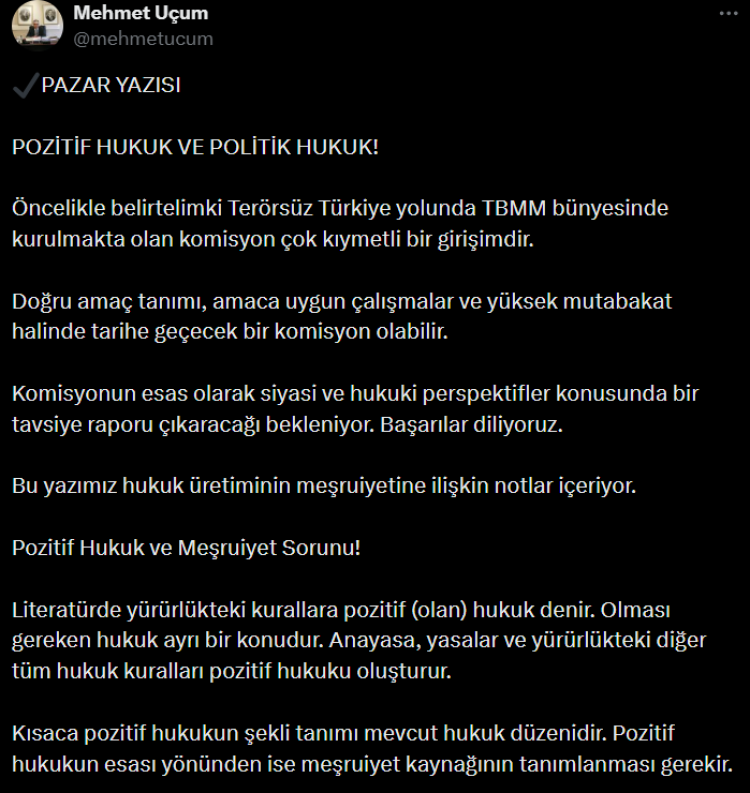 Cumhurbaşkanı Başdanışmanı Mehmet Uçum, X hesabından paylaştığı Pazar yazısında hukuk üretiminde meşruiyetin toplumsal temellerine ve pozitif hukuk ile politik hukuk ayrımına dikkat çekti. “Kural güvencesi kadar kuralsızlık ve kural fetişizmi de keyfilik doğurur” ifadelerini kullandı.