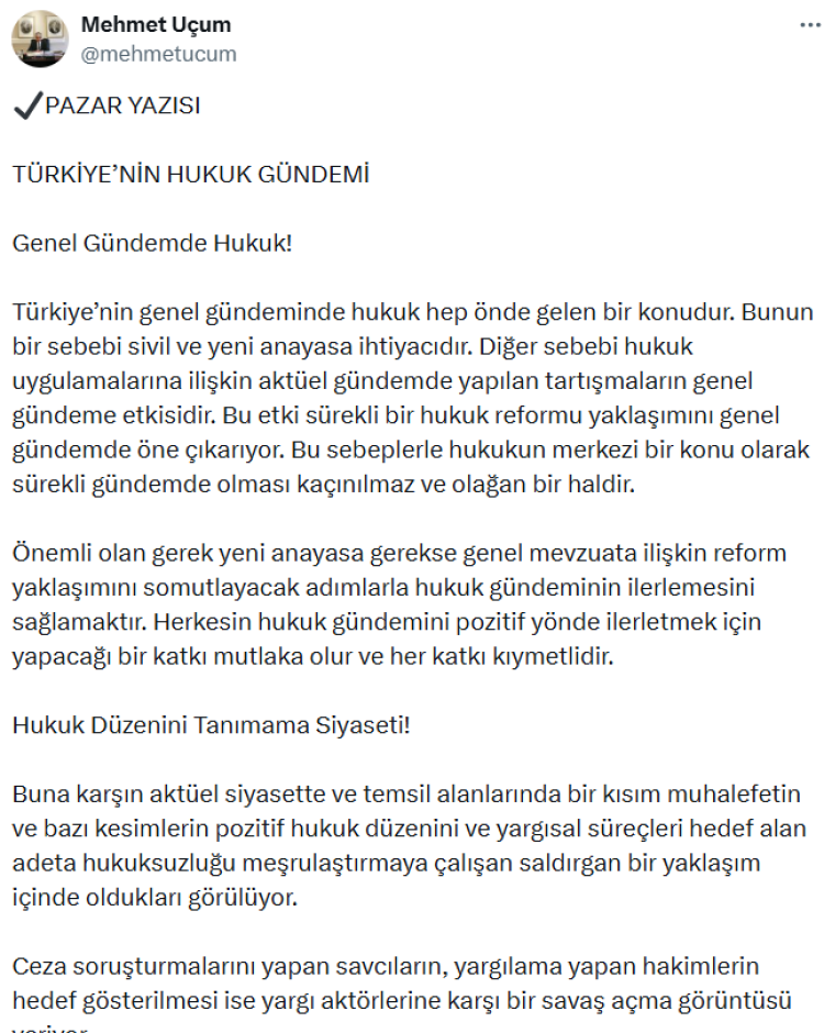 Cumhurbaşkanı Başdanışmanı Mehmet Uçum, resmi X hesabından paylaştığı “Türkiye’nin Hukuk Gündemi” başlıklı pazar yazısında, yeni anayasa tartışmalarından muhalefetin yargıya yönelik tutumuna kadar çarpıcı değerlendirmelerde bulundu. Uçum, “Bir hukuk düzenini tanımayan, o hukuk düzeninden doğan haklardan feragat etmiş gibi olur” ifadeleriyle dikkat çekti.