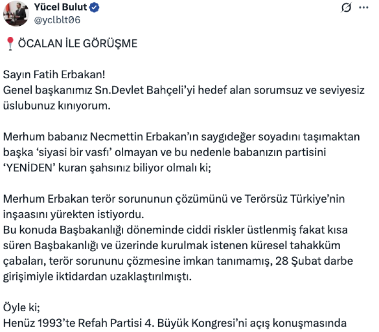 Bulut’un sözleri, hem Fatih Erbakan’ın “terörle müzakere” eleştirisine yanıt niteliği taşırken,