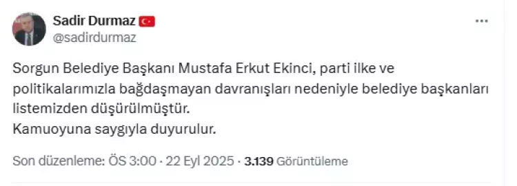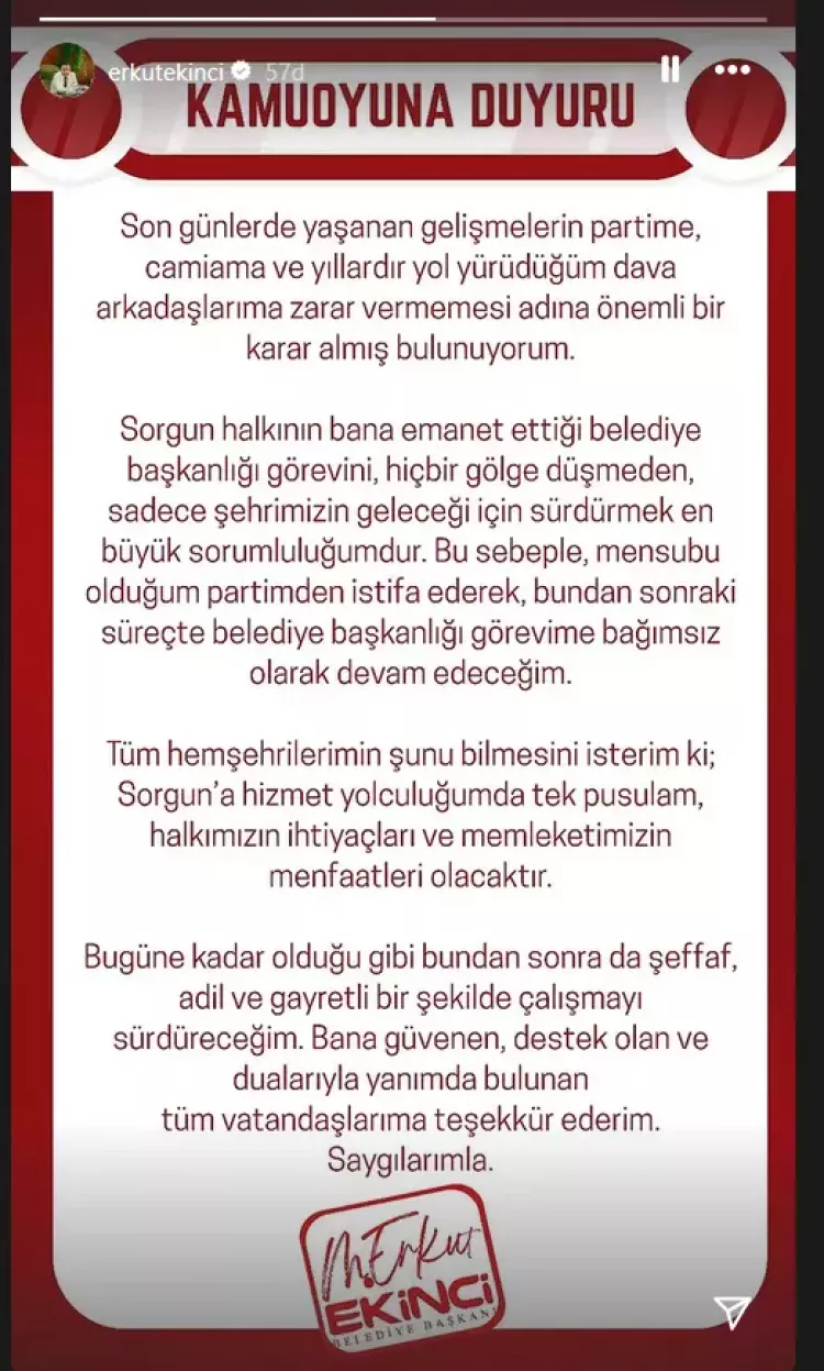 Ekinci, resmi sosyal medya hesabından yaptığı açıklamada son günlerde yaşanan gelişmelere dikkat çekerek, “Camiama ve dava arkadaşlarıma zarar gelmemesi adına önemli bir karar aldım. Sorgun halkının bana emanet ettiği görevi sadece şehrimizin geleceği için sürdüreceğim. Artık tek pusulam halkımızın ihtiyaçları ve memleketimizin menfaatleri olacaktır” ifadelerini kullandı.