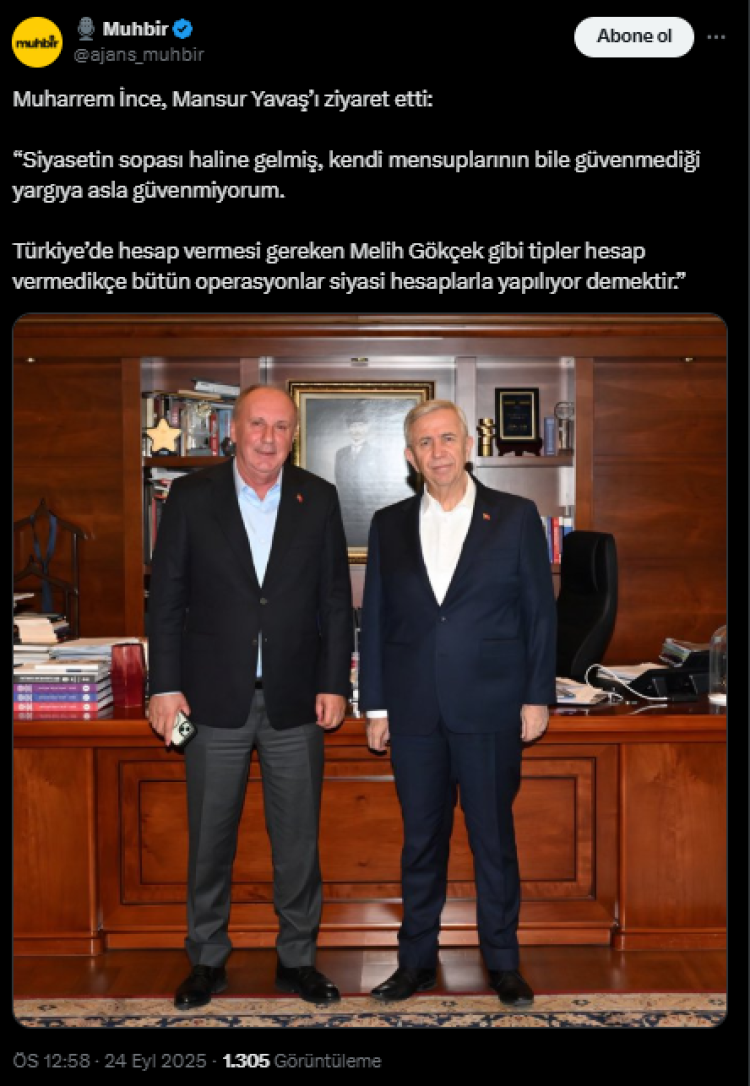Muharrem İnce’nin bu çıkışı, CHP kulislerinde Mansur Yavaş’ın “en güçlü aday” olarak öne çıkarıldığı bir dönemde dikkat çekici bulundu. Görüşme, hem muhalefetin farklı kanatları arasındaki dayanışma hem de iktidara yönelik eleştirilerin ortaklaştığı bir tabloya işaret etti.