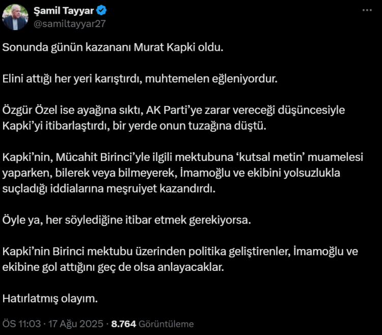 Ancak tartışmalar, Kapki’nin açıklamaları ve yazdığı mektupların siyasette nasıl kullanıldığı sorusunu da beraberinde getirdi. Şamil Tayyar’ın çıkışı, Kapki’nin bu süreçte hem AK Parti hem de CHP içinde farklı tartışmalara neden olduğuna işaret ediyor.