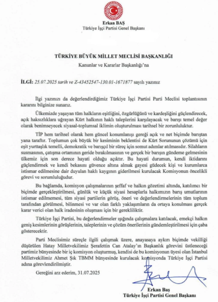 TİP tarafından yapılan açıklamada, Meclis Başkanı Numan Kurtulmuş’a komisyona katılma kararının gerekçeleriyle birlikte iletildiği bildirildi. Açıklamada ayrıca, tutuklu Hatay Milletvekili Şerafettin Can Atalay’a da dikkat çekilerek, onun başkanlığında partide bir iç komisyon oluşturulduğu belirtildi.